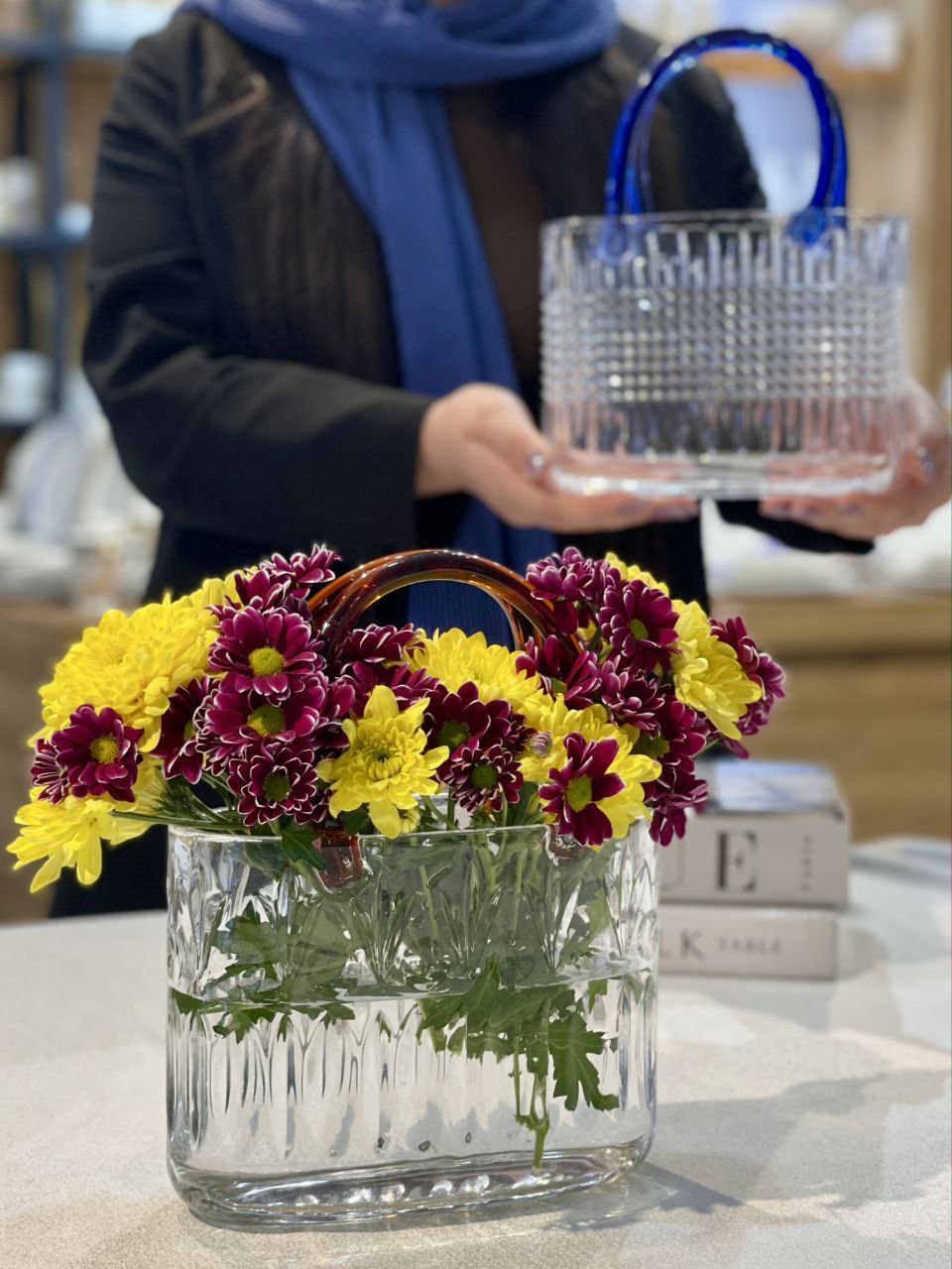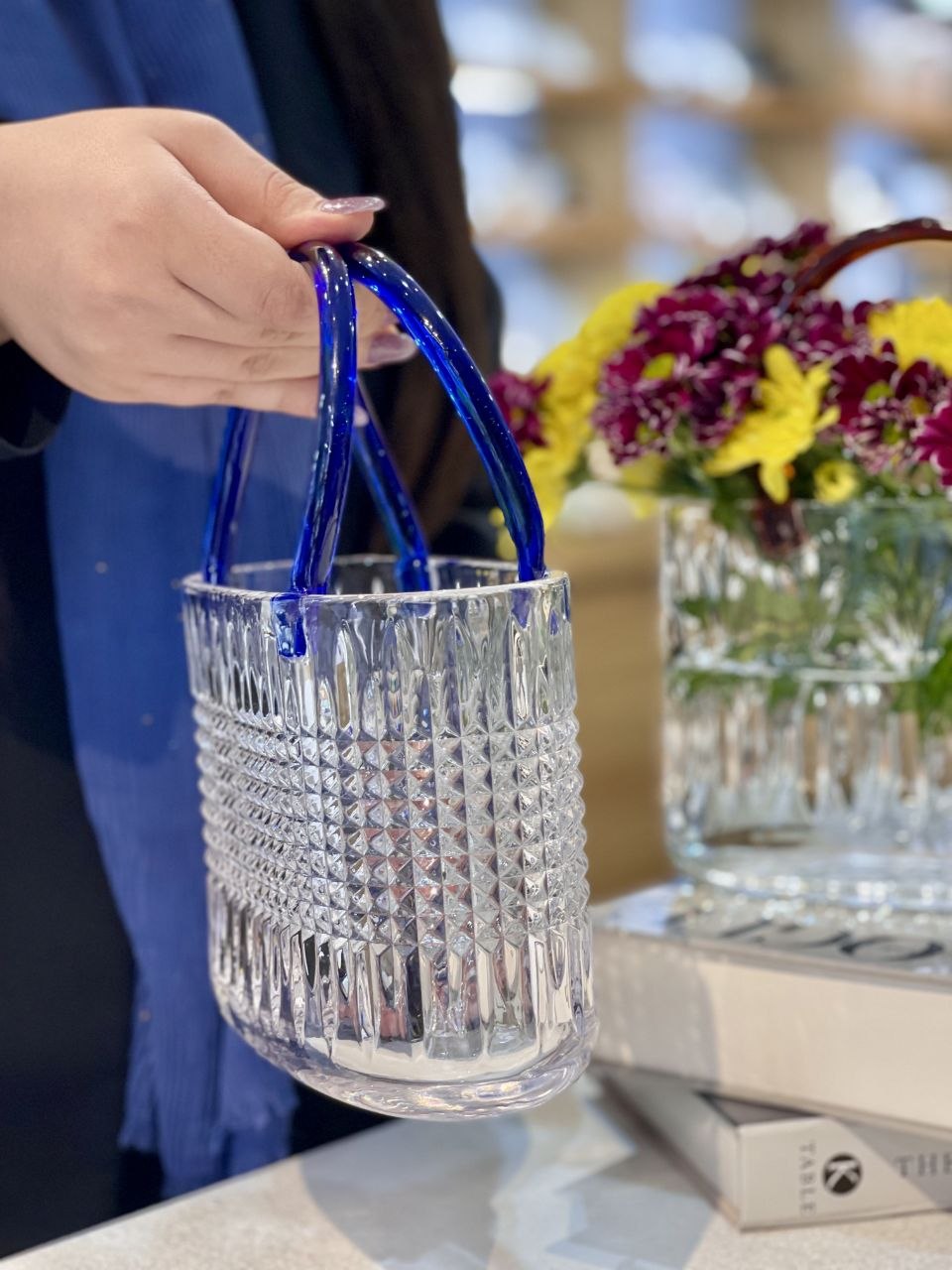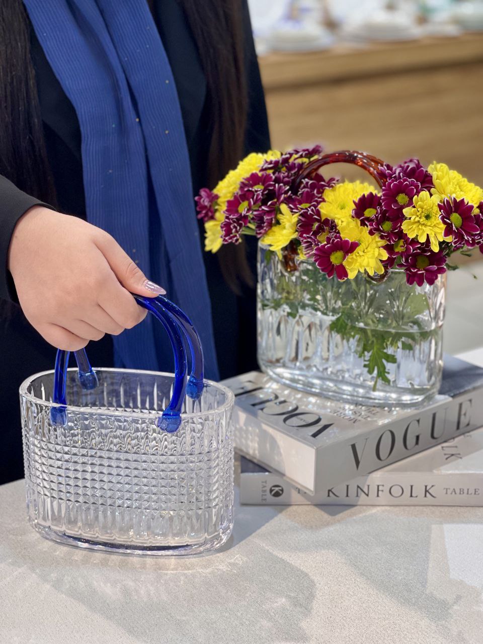 گلدان سبدی کریستالی محصول وارداتی فوق العاده شفاف و براق دستگیره ها رنگ تزریقی و ثابت طول:20 سانتیمتر عرض:10 سانتیمتر ارتفاع:15 سانتیمتر ارتفاع با احتساب دسته:25 سانتیمتر